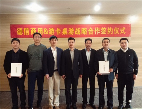 2018年4月24日,浙江德信商用投资管理有限公司(德信商用)与杭州游卡网络技术有限公司(游卡桌游)战略合作签约仪式于杭州隆重举行!德信商用董事长胡斌、总经理鲍寓海,游卡桌游创始人杜彬、副总应晓天等人出席了仪式。
